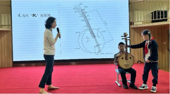 在互动环节。老师邀请了几位孩子上台体验阮的演奏。孩子们虽然初次接触阮,但在老师的指导下,初步掌握了阮的演奏技巧。他们小心翼翼地拨动琴弦,尝试着演奏出简单的旋律。最后,由校民乐队献上了一首儿歌改编的民乐合奏曲目。那独特的音色和富有童趣的旋律,让大家沉浸在美妙的音乐中。