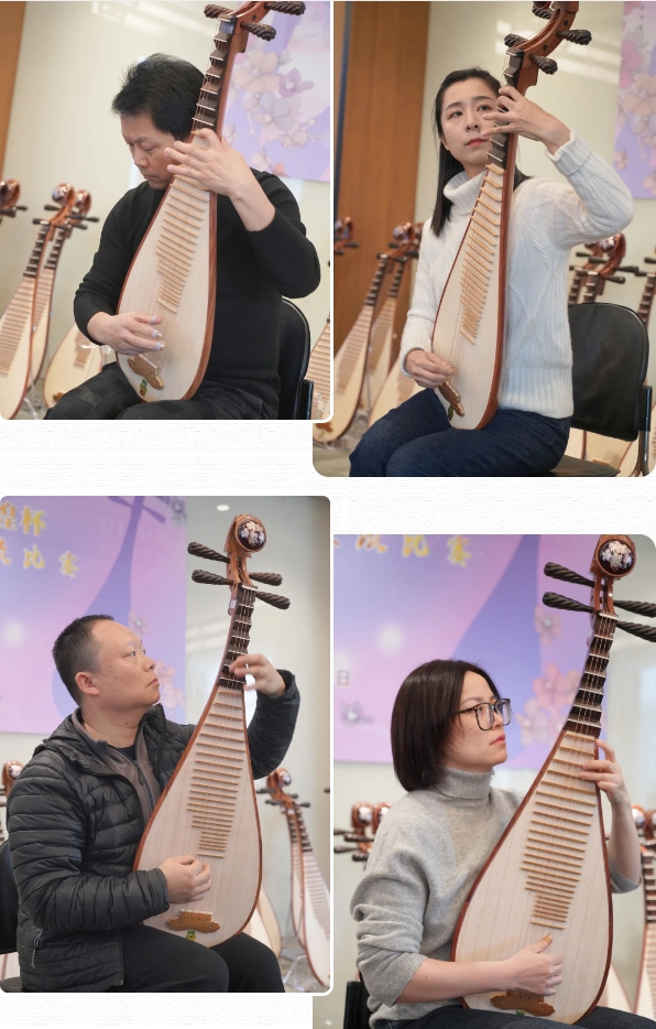 评委们秉持严谨、专业的态度,对参赛琵琶逐一反复弹奏。奉朝红老师表示这批参赛琵琶做工精细,高音区的亮度令人惊喜。陈哲老师也认为琵琶的高音区十分出色,并且声音传导性可圈可点,余韵悠长。
