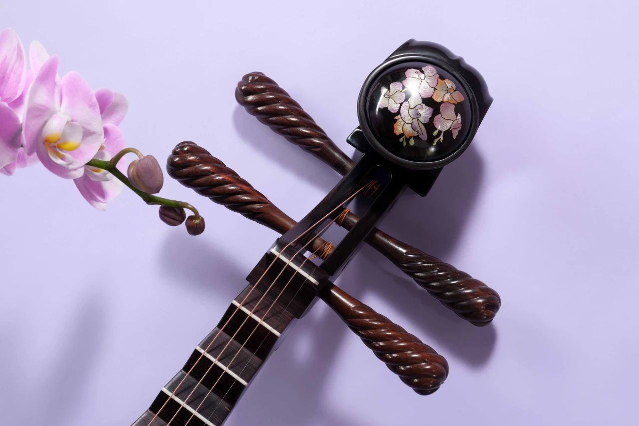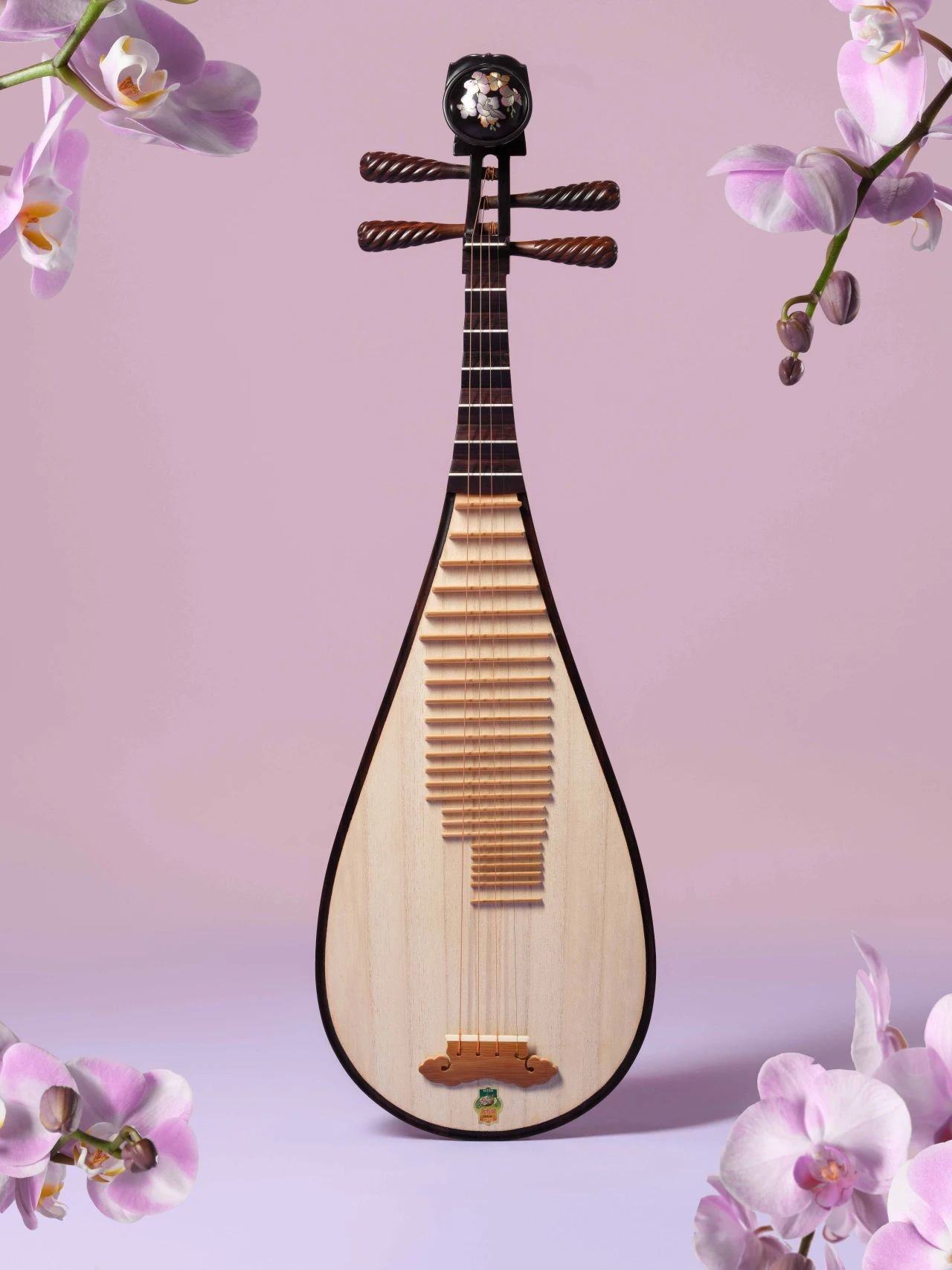 绽放的蝴蝶兰宛如舞动的精灵,在琵琶上悠然摇曳。雕银丝光工艺勾勒出蝴蝶兰的婀娜形态和优雅灵动,尽显古典之美。