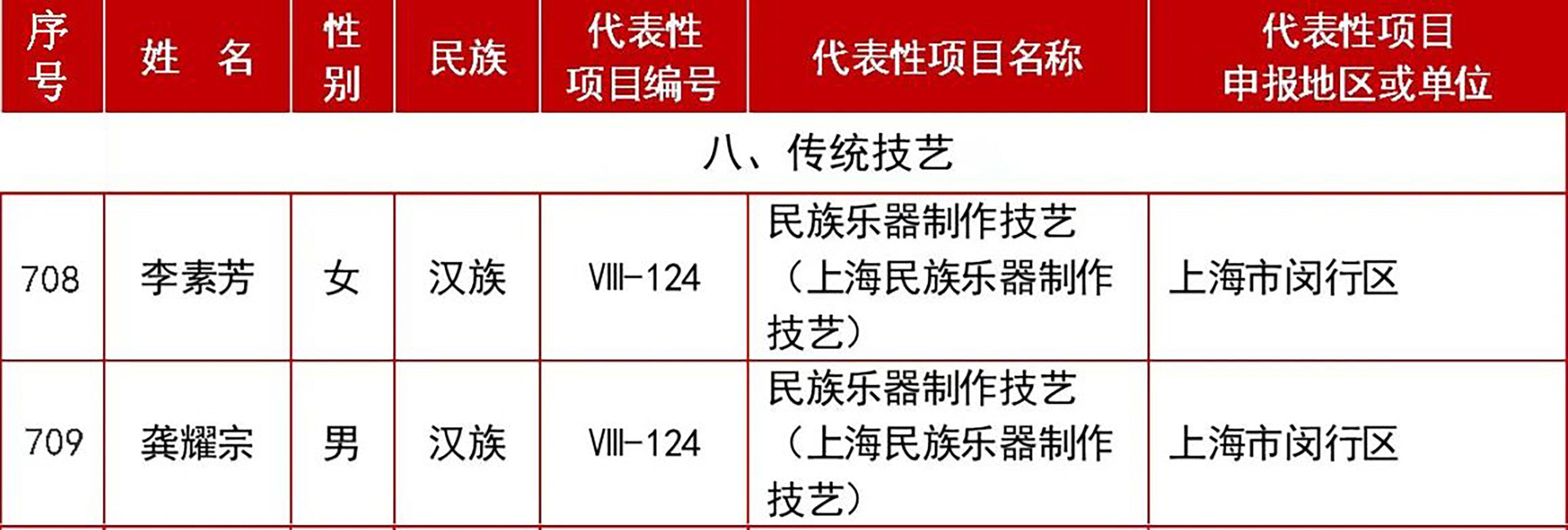 为加强非物质文化遗产传承人队伍建设,进一步提升非物质文化遗产系统性保护能力水平,保护和传承好非物质文化遗产,文化和旅游部组织开展了第六批国家级非物质文化遗产代表性传承人认定工作,并于近期公布名单。其中,上海民族乐器一厂有限公司古筝质量总监李素芳,民族拉弦、弹拨乐器制作技师龚耀宗成功入选!